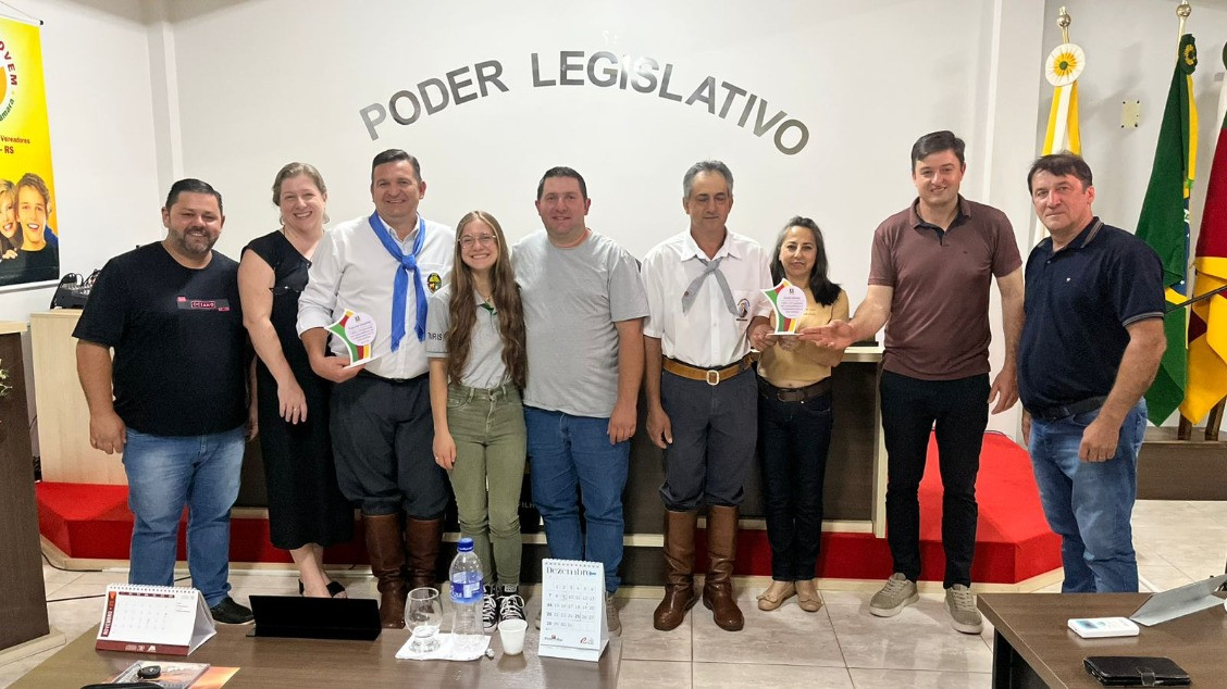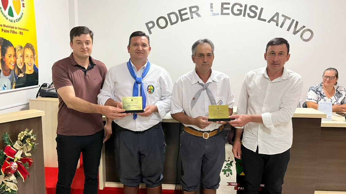 Na oportunidade foi entregue, por indicação das Bancadas do MDB e PP, uma MOÇÃO DE APLAUSO ao Sr. Thiago José Centofante, Coordenador da 29ª Região Tradicionalista e ao Sr. Geraldo Brunetto, pela atuação junto ao tradicionalismo gaúcho, especialmente pela condução da Chama Crioula, vinda de Caxias do Sul, tendo o Sr. Geraldo se deslocado a cavalo durante dez dias, enfrentando as condições adversas do tempo, e o Sr. Thiago acompanhando a tropa da região com um ônibus contendo mantimentos para a viagem.